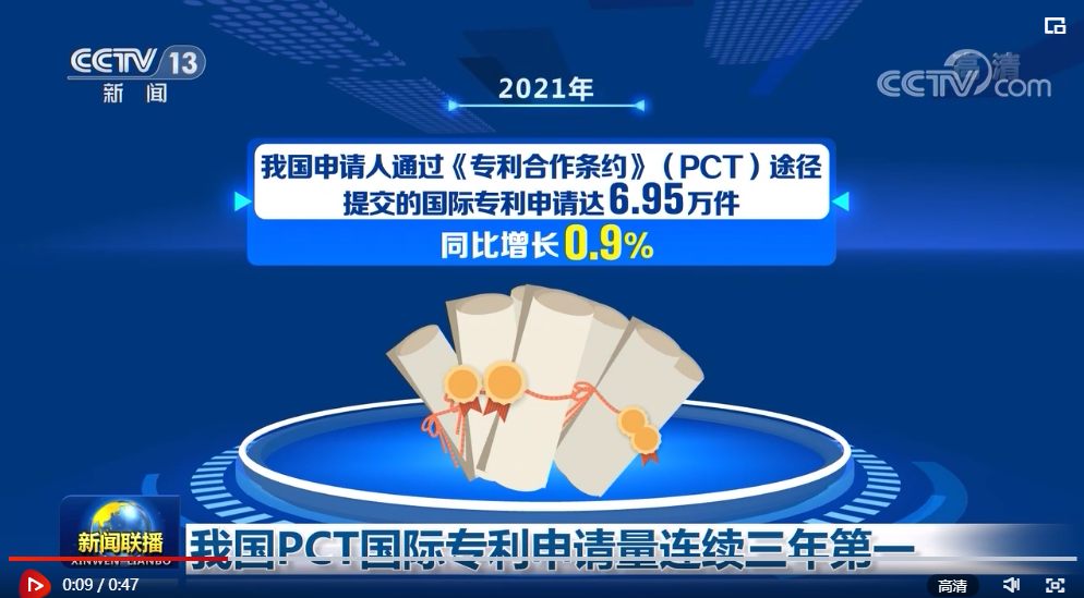 央视网消息(新闻联播):世界知识产权组织2月10日发布数据显示,2021年,我国申请人通过《专利合作条约》(PCT)途径提交的国际专利申请达6.95万件,同比增长0.9%,连续第三年位居申请量排行榜第一位,申请量排名前5位的国家分别是中国、美国、日本、韩国和德国。去年,共有13家中国企业进入全球PCT国际专利申请人排行榜前50位,其中,华为以6952件申请连续五年位居榜首。中国共有19所高校进入全球教育机构PCT国际专利申请人排行榜前50位,较2020年增加4所,为上榜高校数量最多的国家。