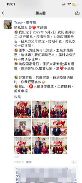 新娘崔祥瑞在朋友圈分享了自己这场特殊婚礼的照片,穿着旗袍和西装的新人笑容甜蜜,让不少朋友心生感动,纷纷送上留言祝福。