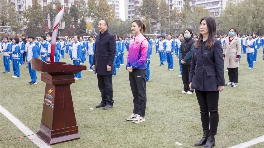 仪式第三项,传递火炬。北京,是全球首个也是唯一的“双奥之城”,奥林匹克精神在此凝聚。作为首都青少年,我们感到荣幸,更应将奥林匹克精神浸润到生活和学习的每个角落。丁宁同志将来自冬奥会的火炬传递给同学们,高中,初中,小学三个学部的学生代表依次接过火炬。自八十多年前,心怀信仰的革命志士,缔造出名为“长征”的奇迹,传递着可以燎原的星星之火;今天,聚宽学子传递着冬锻的火炬,更传承着长征的精神。同学们的誓言振聋发聩:磨砺精神,强健体魄,复兴圆梦,强国有我!
